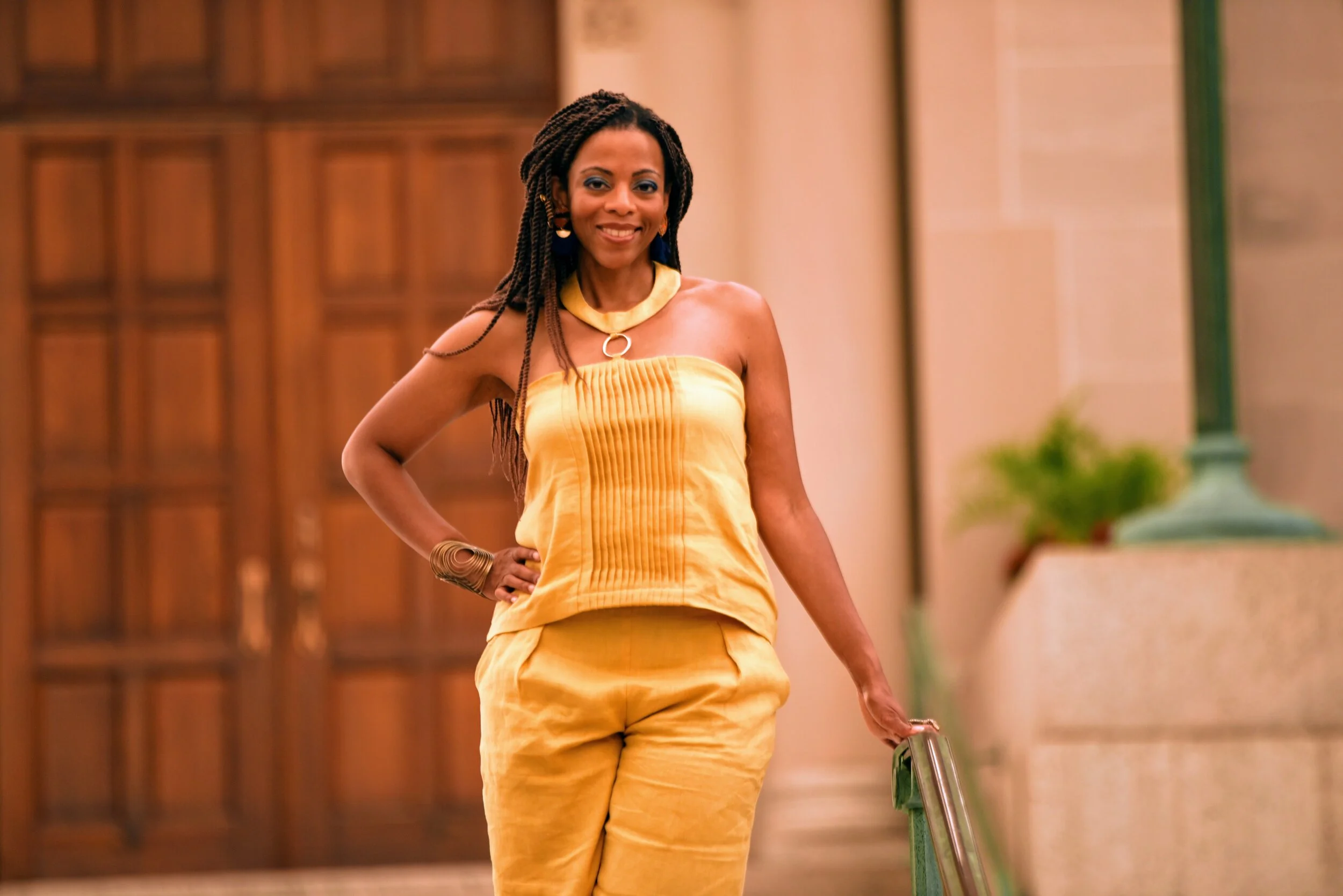 For every project I do, I like to add a special or unusual detail. It keeps the garment interesting and also helps me learn new skills. I had made these pants using Simplicity Pattern S8956 using a beautiful maize linen I got from Fabricmart.com. I knew I wanted a matching top to go for a monochromatic look but I went back and forth for months trying to decide on the final design. I had some gold rings that I also got from Fabric Mart which would make a special detail but I still wanted something more.